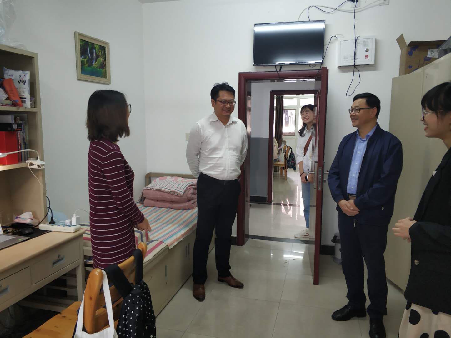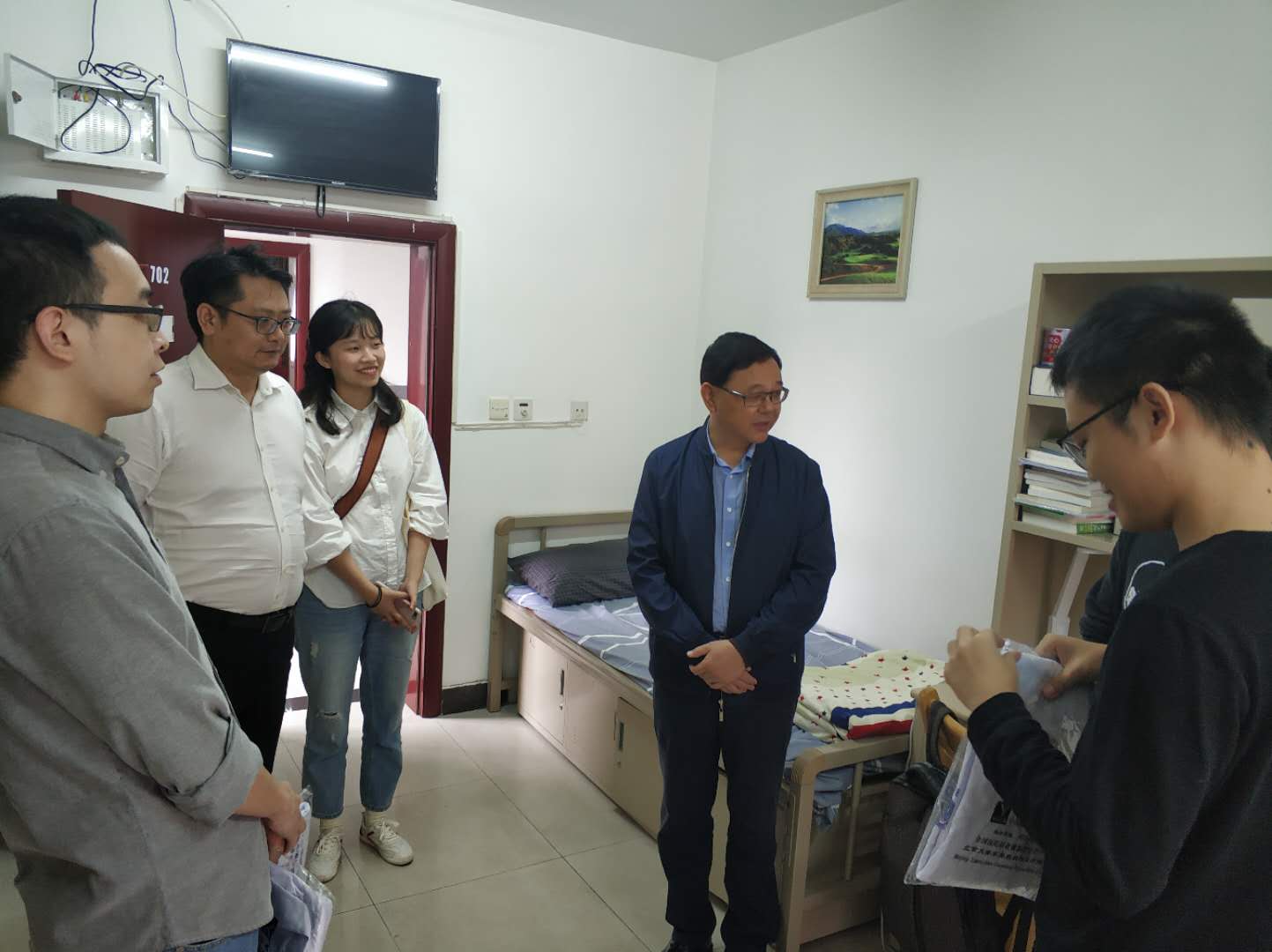 刘国祥一行逐一走访了医学院学生全部21间宿舍,详细询问每一位新生在住宿、饮食、环境适应、与导师日常交流等方面的具体情况,仔细聆听学生们所反映的困难问题,现场督促相关部门和人员跟进落实解决。他还特别提醒同学们在疫情防控常态化下,要注意天气变化,加强体育锻炼,增强个人安全卫生防护,保持良好的学习生活规律。同学们对学院领导、老师的到来倍感振奋,纷纷表示学校和学院的管理服务让他们感到很舒心,老师们的到来令他们感到很温暖。大家表示会严格遵守并积极配合学校疫情常态化防护规定,健康有序地进行学习和生活。