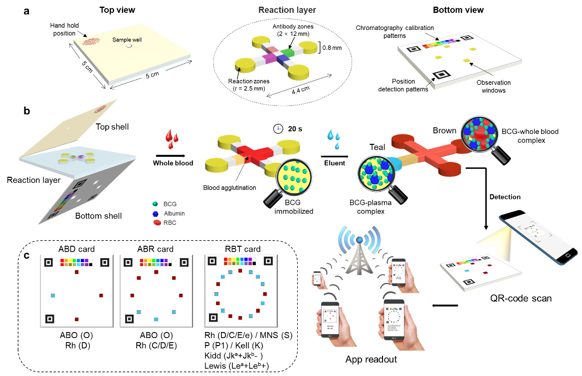 快速、准确的血型鉴定对急救抢救、器官移植等多种场景至关重要。尽管传统经典的试管和凝胶卡式法在临床应用中占主导地位,但因其耗时较长,依赖实验室仪器等局限,导致其难以满足户外筛查和紧急救援中快速血型分型的要求。玻片法虽然便捷快速,但是其准确率较差,其中因表面抗原表达弱等导致的样本弱凝集极大降低检测准确率。在微型化检测卡中提高弱凝集样本检测灵敏度是实现快速、准确的户外血型检测需要克服的关键难题。