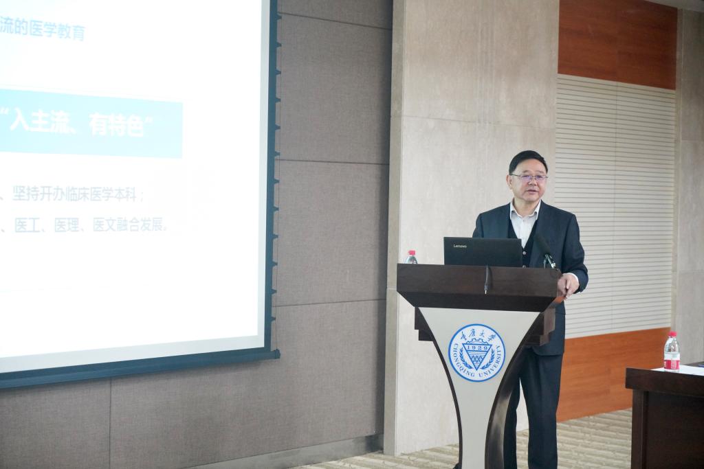 学校医学部主任兼医学院院长刘国祥围绕《重庆大学临床医学本科专业培养方案》,全面详细地介绍了医学院关于申办临床医学本科专业的顶层设计构想、工作准备情况、课程体系设计等人才培养方案相关方面的内容。