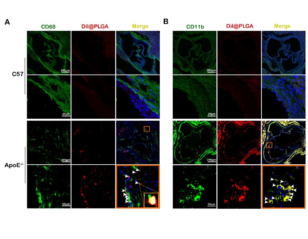 如Figure 1和2所示,在12周高脂喂养的ApoE-/-小鼠AS动物模型中, PLGA NPs长期给药后,显著促进了ApoE-/-小鼠AS斑块的形成。较之C57小鼠阴性对照组,PLGA NPs与炎症标记物CD68和CD11b共定位显示PLGA NPs会在斑块部位聚集。这一结果表明PLGA NPs与炎症反应密切相关,并且在尾静脉注射PLGA NPs 12周后,PLGA NPs引起炎症因子释放增加。