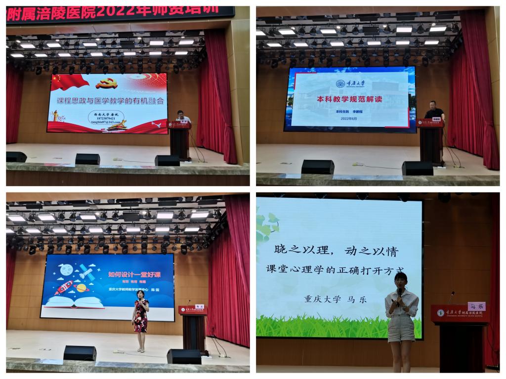 西南大学唐斌副教授以《课程思政与医学教学的有机融合》为题,教育引导医师们始终把人民群众生命安全和身体健康放在首位,着力培养学生“敬佑生命、救死扶伤、甘于奉献、大爱无疆”的医者精神,做党和人民信赖的好医生;重庆大学本科生院教学运行科科长李鹏程就《重庆大学本科教学规范解读》为题,围绕本科人才培养系统整体构架,从教师资格、开设新课、教材选用、教学评价、教学事故等环节,对重庆大学本科教学规范进行了全面细致的解读;重庆大学教师教学发展中心陈圆副教授以《如何设计一堂好课》为题,分享了一堂好课的设计思路,强调以“学习者为中心”的教学理念和方法,提出有效课堂教学的六个要素及其操作要领;重庆大学自动化学院马乐副教授以《课堂心理学的正确打开方式》为题,分享了培养良好师生关系、激发学生学习动机、建立学习共同体、营造正向学习氛围等实用策略,并解读了这些策略背后的心理学原理。