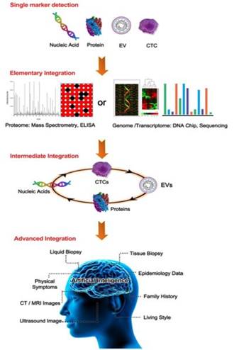 从生物检测的角度来看,任何与肿瘤生长和转移高度相关的生物标志物,包括循环蛋白(CPs)、循环肿瘤DNA(ctDNA)、循环肿瘤RNA(ctRNA)、细胞外囊泡(EVs)、循环肿瘤细胞(CTCs)和肿瘤教育的血小板(TEPs)都对癌症的早期检测有着重要的意义。然而当采用不同的方法分析单一的生物标志物时往往会因为分析方法的不同而产生不一样检测结果。为此,这篇综述针对液体活检在现阶段临床应用所面临的问题和困难,首次提出了“整合液体活检”的定义,即整合多种液体活检生物标志物或检测方法以提高灵敏度和特异性的检测策略。