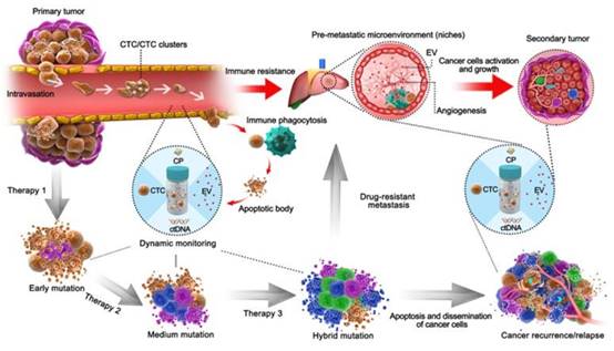事实上,集成化的液体活检是由于肿瘤的异质性决定的,已有研究显示肿瘤难治疗以及耐药性强等都是由于其高异质性。因此,为了提高个体化治疗的效果,利用整合液体活检策略是监控治疗差异和新突变以实现个性化治疗的关键(图4)。