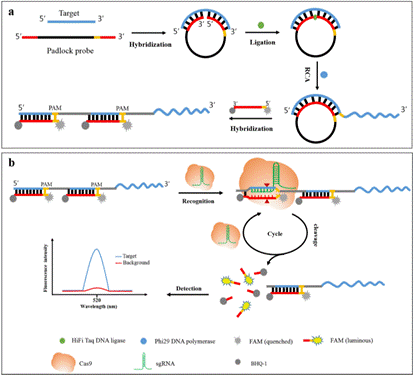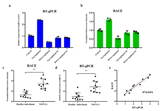 重庆大学医学院团队研发的等温多靶标核酸检测系统(RACE),很好的弥补了上述缺憾。众所周知,滚环扩增(RCA)是一种高度特异的恒温核酸扩增方法,在具有热稳定性的DNA聚合酶的辅助下无需热循环仪器,恒温条件即可进行核酸扩增。RCA反应的高特异性主要归因于靶标和环状DNA模板之间需完全互补才得以启动扩增步骤,这使得它特别适用于单核苷酸多态性(SNP)的分析。在CRISPR/Cas9这一经典的基因编辑系统中,Cas9蛋白在单链引导RNA( sgRNA) 存在的情况下,通过识别含有PAM结构的双链DNA而进行精准剪切,可用于高效、快速地核酸精确检测。本项目中,RACE核酸检测系统综合了RCA和CRISPR/Cas9技术的优点,构建出一个多功能的等温多靶标核酸检测平台,可用于胞外囊泡内多种miRNAs的等温定量分析,这对于疾病诊断和预后评估具有重要意义。方法学评价结果表明,RACE与miRNA检测金标准方法RT-qPCR
