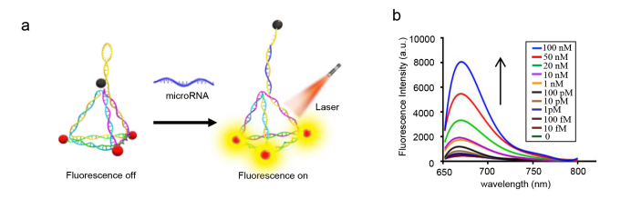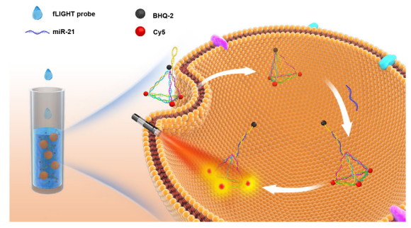 研究者们设计的fLuorescent Intracellular-Guided Hairpin-Tetrahedron (fLIGHT)四面体纳米探针,尺寸为5.4~8.0 nm,结合发卡探针实现靶标miRNA的互补,分子信标的茎环结构和各荧光基团间的发光效应,直接实现sEVs内miRNA分子表达丰度的检测,其检测限为45.4 fM,见图2。