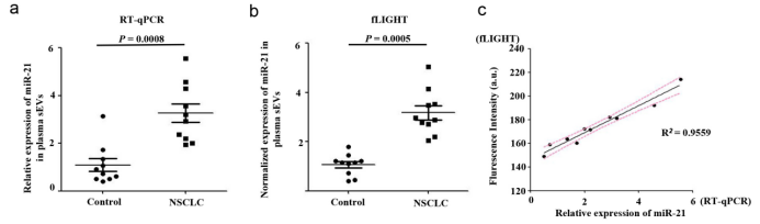 图4. fLIGHT检测临床非小细胞肺癌患者血浆sEVs内miR-21