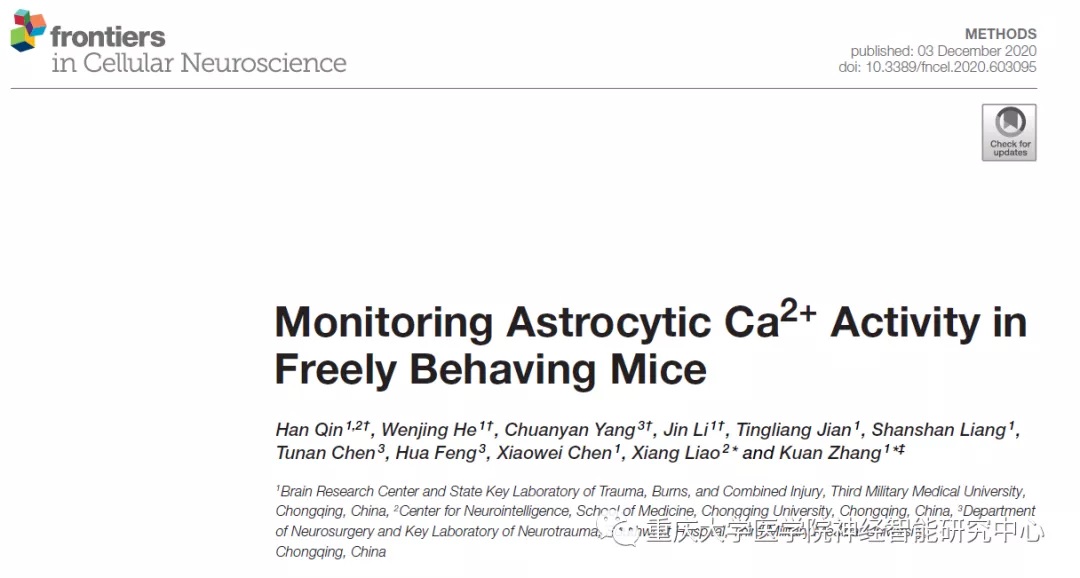 2020年12月3日,重庆大学医学院神经智能研究中心覃涵、廖祥团队联合陆军军医大学基础医学院脑科学研究室张宽团队在Frontiers in Cellular Neuroscience杂志发表标题为Monitoring Astrocytic Ca2+Activity in Freely Behaving Mice的文章(链接:https://www.frontiersin.org/articles/10.3389/fncel.2020.603095/full),建立了自由活动小鼠大脑星形胶质细胞Ca2+活动记录方法,为研究大脑胶质细胞的行为学功能提供了关键技术。