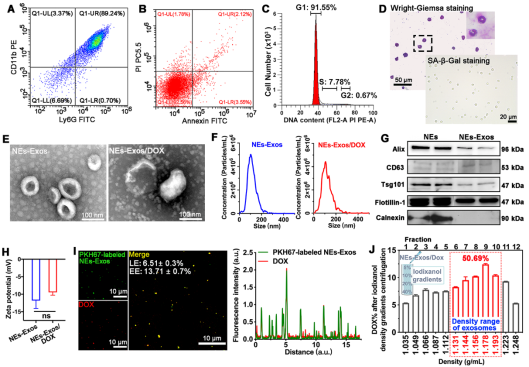 外泌体作为细胞外囊泡的一种,由于其具备纳米效应、生物相容性、来源细胞生物学特性以及天然透过生理屏障效应,已经成为药物递送研究领域极具吸引力的新型载体。在本研究中,我们利用中性粒细胞的趋炎特性构建了响应炎症微环境的中性粒细胞外泌体药物递送系统(Neutrophil-Exosomes, NEs-Exos)(如Figure.1所示)。