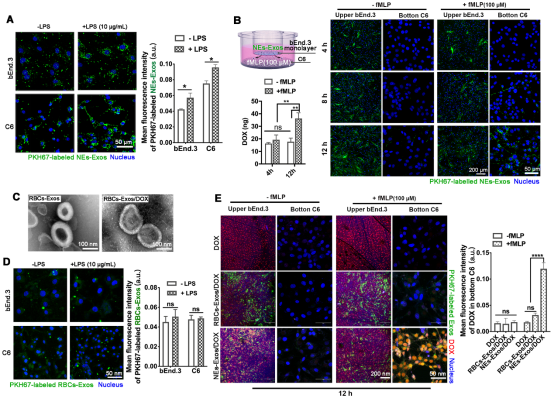如Figure 2所示,LPS炎症诱导能显著增强C6与bEND3细胞对NEs-Exos的吞噬,与游离阿霉素(DOX)和红细胞外泌体对照,Transwell小室迁移模型的激光共聚焦影像和下室DOX定量分析都证明了NEs-Exos能够响应炎症趋化因子fMLP,具有与来源细胞中性粒细胞相似的炎症趋化特性。