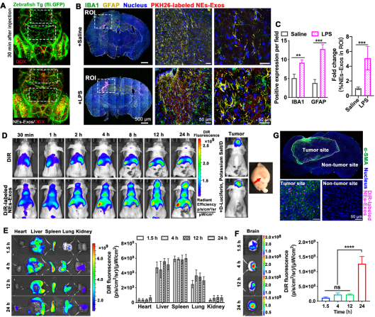 通过斑马鱼模型(转基因斑马鱼,绿色荧光蛋白标记血管)透BBB评价可知,NEs-Exos/DOX(红色荧光)能够成功穿透BBB到达脑实质(Figure 3. A)。NEs-Exos(PKH67标记)静脉注射LPS诱导颅内炎症模型小鼠,相较于生理盐水对照组和非炎症区域,脑切片免疫荧光结果(Figure 3.B)证实NEs-Exos显著聚集于炎症区域(IBA1高表达),而Figure 3.G的结果也进一步指出NEs-Exos聚集区域与肿瘤组织区域高度一致。这些结果充分表明NEs-Exos能够趋向肿瘤组织的炎症微环境。与游离DiR相比(图Figure 3.D-F),NEs-Exos/DiR能够突破BBB生理屏障,携带DiR入脑。胶质瘤原位移植模型药效学实验评价结果表明,NEs-Exos/DOX相较于对照组和游离DOX组,使得胶质瘤快速生长受到抑制,同时,其荷瘤鼠Kaplan-Meier生存曲线显示较之其他组生存期显著延长,体重变化监测提示生存质量得以明显改善。不仅如此Ki67、GFAP和IL-33免疫组化结果也进一步揭示肿瘤的恶性程度显著降低。本文充分证明了NEs-Exos/DOX具有炎症响应特性,能跨越BBB生理屏障靶向聚集于肿瘤炎症微环境,提高抗胶质瘤效应。该研究不仅有助于为胶质瘤提供新的给药策略,也能为其他中枢神经系统疾病的非侵入性炎症微环境靶向药物递送提供新的选择。