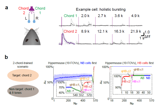 图3:a,经过复杂声音辨别学习,小鼠听觉皮层神经元针对学习到的声音(Chord 2)产生高强度反应,而对其它的声音刺激不反应。b,加入少量HB细胞的皮层神经元网络对复杂声音的解码准确率达到100%。