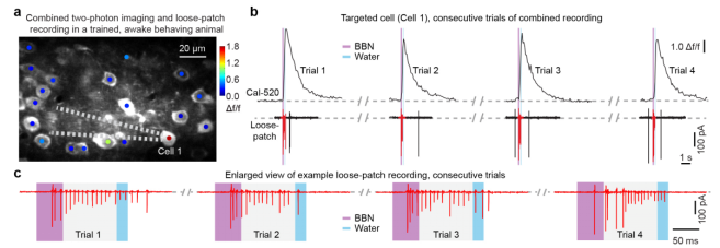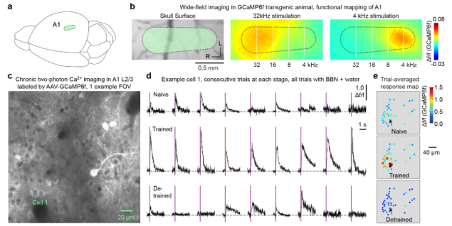 基于先进的高分辨率双光子钙成像与单细胞电生理联合记录技术,研究者们发现听觉皮层存在一群稀疏分布的神经元,每一个神经元都稳定地对学会的复杂声音呈现出一种特殊模式的簇状脉冲高频发放反应(burst firing,瞬间发放频率约100 Hz,持续时间100-250 ms)(图1)。长期成像实验揭示,产生这种簇状脉冲高频发放是在学习过程中涌现出来的特性,并且只在很小比例(约5%)的神经元中发生(图2)。